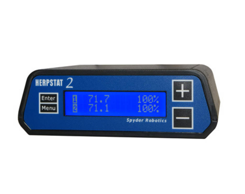The Herpstat 2 is an advanced digital reptile thermostat that lets you control two totally separate heating units at once. This temperature controller allows you to set the desired temperature individually for each heating or cooling device. Using the premium, steel-tipped sensor probes included with the device, this proportional thermostat constantly monitors and adjusts amount of heat necessary to maintain a target temperature for your reptile enclosure.